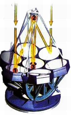 Одно из семи параболических зеркал (1) собирает свет далеких звезд. Суммарный световой поток концентрируется на вторичном зеркале (2) и отправляется через отверстие (3) в центральном зеркале на дальнейшую обработку.