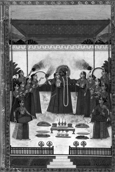 Кришна, Радха и гопи празднуют Холи. Индийская миниатюра