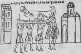 Потім ноклали тіло Гліба до кам’яної труни, поставили її на сані, взялись за мотузки й потягли її до церкви й поставили там другого дня місяця травня». Пізніше, за часів Володимира Мономаха, вирішили перенести останки обох князів до Вишгородської церкви, і для цього також вибрали другий день місяця травня «Після того, як спочатку поставили труну святого Бориса на гарні, спеціяльио для того зроблені сані, її повезли до церкни, тягнучи за великі мотузки... таким способом перенесли потім тіло святого Гліба, поставивши його на другі сані». Долучені до цього пам'ятника три гравюри показують нам: перша — двох слуг, що спускають на санях тіло святого Володимира через отвір, розібраний наполовину; друга (мал. 1) — чотирьох осіб, які несуть на плечах тіло св. Бориса, що також лежить на