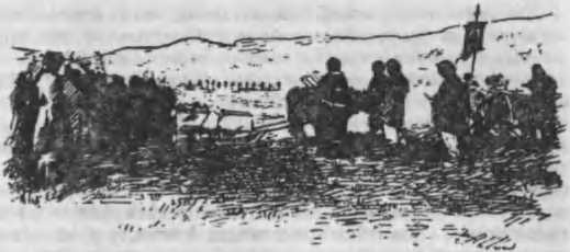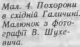 У гуцулів на Буковині труну несуть... на двох дрючках... а то везуть на возі або ми санях, запряжених волами трапляється, що мерців перевозять на санях навіть літом'53. Нарешті, з властивої ехідньої Галичини ми маємо дуже цікаву фотографію, яку ми тут репродукуємо (мал 4) і яку зняв зовсім недавно (1894 р.) український учений проф. Шухевич у Березові Коломийсь кого повіту10. Малюнок цей показує похоронний похід, що слинився по дорозі для читання молитв, як це звичайно робиться на Україні. Труна лежить на санях, запряжених волами. її закрито, як це наказує звичай, коли похоронна процесія має довгу дорогу; на віці труни знаходиться хліб та кутя Священик, оточений кількома особами, що тримають свічки, читає Євангеліє, а натовп селян з непокритими головами стоїть за труною. Жінки, що згруповані зараз же за труною, це — планки. Відсутність снігу та віз, що стоїть перед саньми, вказують нам на те, що це чиниться літом (фотографію знято в серппІ місяці) і що саней в цьому випадку вжито також цілком ритуальним способом.