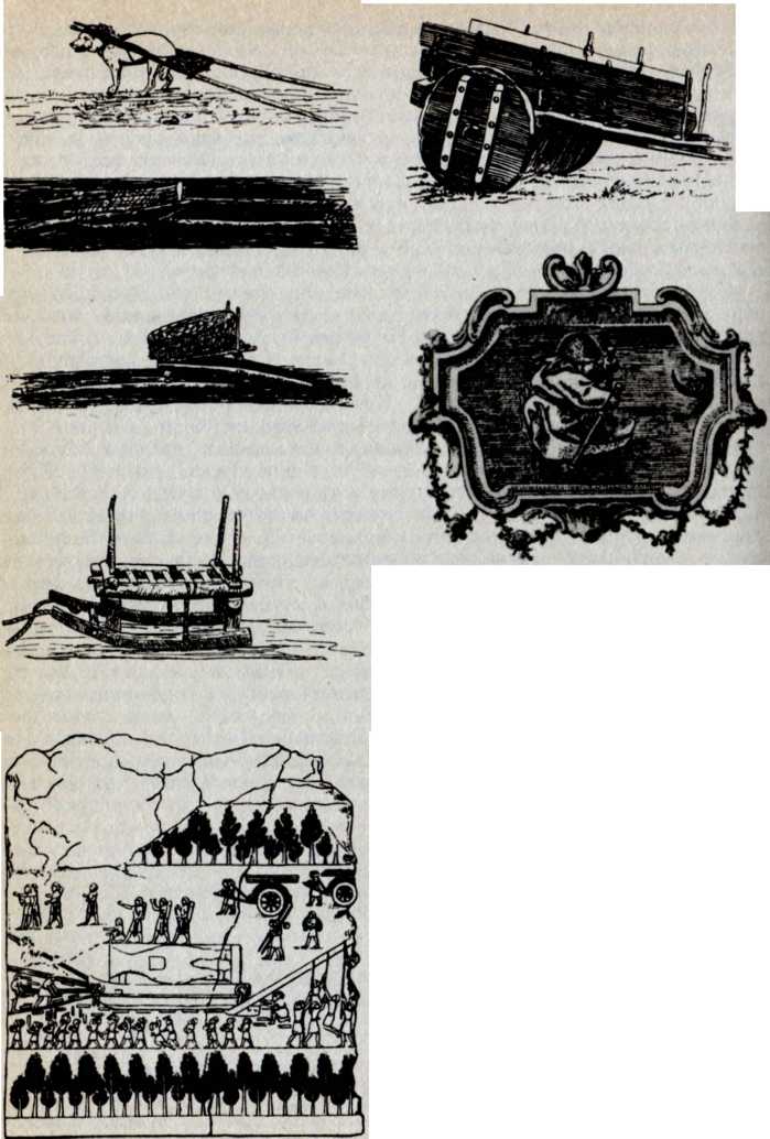 Щодо возів, то Ед. Тайлор уже давно зазначив, що їх первісне походження треба шукати в котках або циліндричних шматках дерева, на яких приміщували вантаж та які перетворились потім на колеса з нерухомою віссю56. Але ці котки з’являються первісно як додаток до саней, що їх приладжували під полозами. На ассирійських пам’ятниках знаходимо барельєфи, де представлено сцену перевозу колосальної статуї; вона лежить на санях, а під них підкладено котки (мал. 9) 57.
