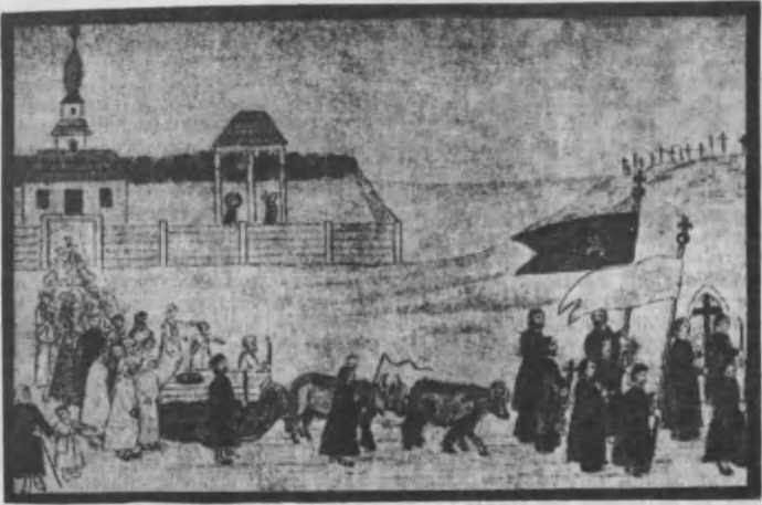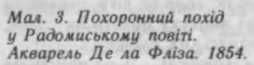 Цей малюнок репродуковано з оригіналу, що знаходиться в невиданому рукописі, переховуваному в Музеї Христіянської Археології у Київі; він представляє повну сцену похоронного походу в одному з сел Радомчського повіту на Київщині. Процесія виходить з дерев'яної церкви, за церквою можна запримітити сад, і дерева в ньому вкриті повним листям, а це вказує на те, що похорон одбувається літом. На маленькій дзвіниці дво. лодей дзвонять по вмерлому. На чолі походу, маючи перед собою двох помішників, що несуть великі свічки з чорного воску (або, може, з темно-зеленого, як це наказує й тепер звичай на Україні), іде селянин, тримаючи великого хреста, вкритого вишиваним рушником. За ними йдуть люде, що несуть церковні корогви з хрестами зверху, а за ними двоє ниших, що несуть: один — меншого хреста, другий — книгу чн образ. Далі йде священик в рнзах з хрестом та кадилом у руках у супроводі діякона чи дяка. Зараз же за духовенством їдуть сані, запряжені двома парами волів, а на санях поставлено труну з дощок, і на ній хліб та сіль. За труною йде кілька заміжніх жінок з білими намітками на голові та вдягнених у свити, також з білого сукна. У натовпі можна розпізнати дівчат по тому, що в них голови не покриті, а тільки зав'язані барвистими стрічками. Всі. крім священика та чоловіка, що несе книгу, взуті, мабуть, у постоли з свинячої шкіри або. може, з луба, постали ці перев’язані довгими волоками (шнурками) Коло волів іде погонич з батогом, а з обох боків саней дві особи зі свічками також із воску темної барви і, нарешті, трохи далі двоє сліпих старців з своїми малими поводарями, що мають великі торби длн милостині В перспективі видко цвинтар на горбочку, означений могильними хрестами.