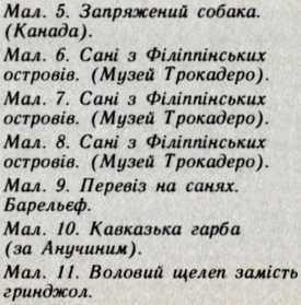 Нелегко знайти всі ці посередні форми. Наша стаття тільки додаток до праці Анучина; тому ми користуємося нагодою з цієї точки погляду звернути увагу наших колег на ріжні форми саней на Філіппінських островах; ми подаємо їх тут в малюнках, зроблених з фотографій Музею Трокадеро з ласкавого дозволу д-ра E. Т. Гамі (Dr. E. Т. Наглу). Малюнок 6 показує сані, де вже два дрючки поділено на два відрізи, хоч це ще зроблено дуже недосконалим способом,— мабуть, тому, що цей повіз призначений для доріг, не вкритих снігом. Малюнок 7 дає нам зразок таких самих саней, але вони вже мають кадку в формі кошика. Нарешті, малюнок 8 показує справжні сані з трохи загнутими полозами; сані ці дуже подібні до українських саней, що ними користуються зимою для перевозу сіна. Замісць оглоблів у них мотузки. Ці сані з Філіппінських островів тим цікавіші, що вони походять з країни, де ніколи не буває снігу; це може бути до певної міри доказом того, що сані легко могли з’явитися як засіб перевозу в теплих країнах і дати початок повозові на колесах.