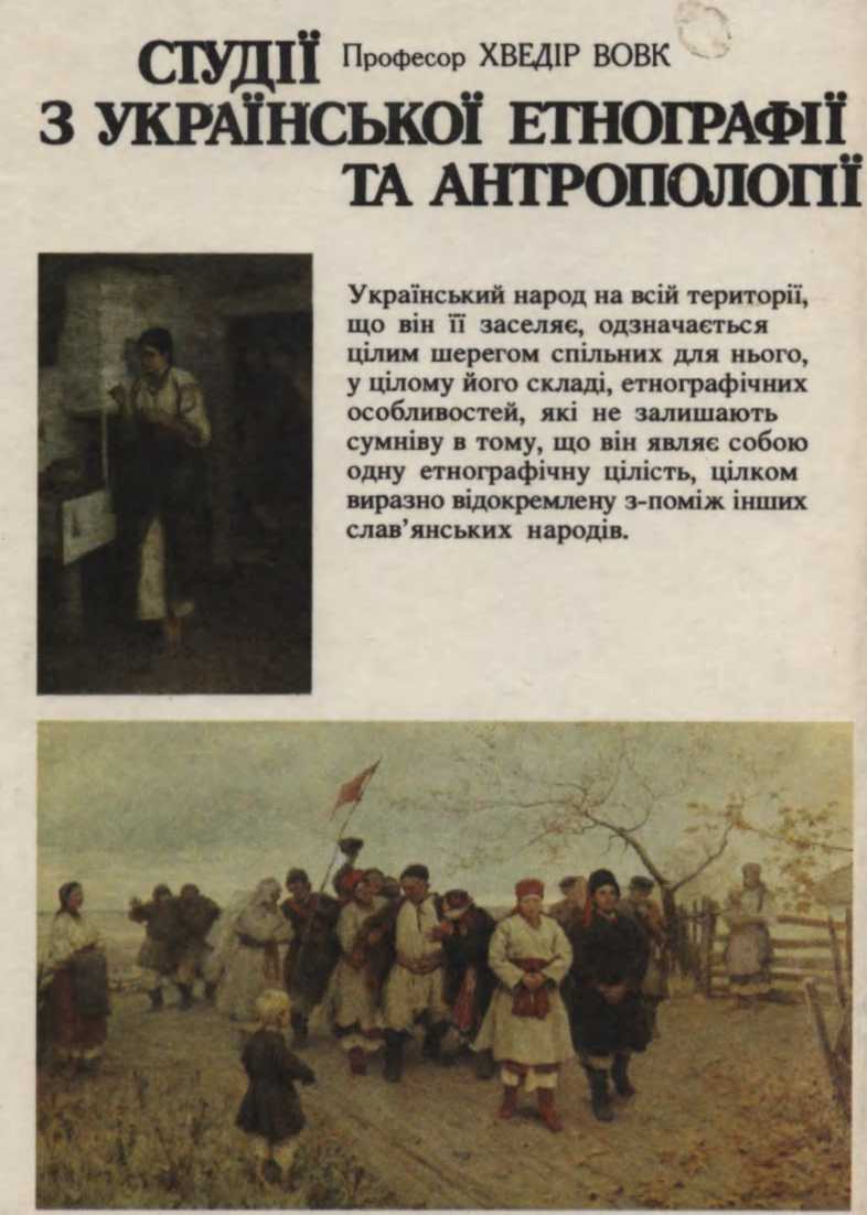Антрополог, етнограф, археолог, літературний критик X. К. Вовк (1847— 1918) у своїх наукових дослідженнях розвінчував вигадки російських імперських учених, котрі вважали Україну всього лиш «югом России». Він переконливо доводить, що український народ усіма своїми особливостями відмінний від сусідніх і являє собою окрему, неповторну антропологічну та етнографічну цілість.