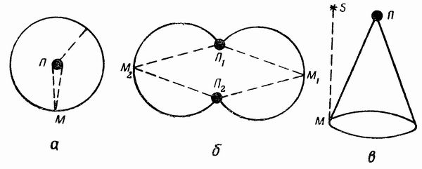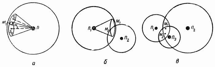 Измеряя направления на небесные светила, углы между направлениями на центры, угловые размеры диаметров планет (Солнца, Луны) или расстояния до их центров и комбинируя эти методы определения поверхности положения, можно получить несколько способов вычисления координат в межпланетном полете. Например, в результате измерения углового диаметра планеты или Солнца и направления на две звезды, получаются сферическая и две конические поверхности положения с общей вершиной в центре планеты (Солнца). Линии пересечения сферы с конусами являются окружностями, в пересечении которых получаются две точки М1 и М2. Одна из этих точек и является действительным местоположением космического корабля (рис. 44, а).