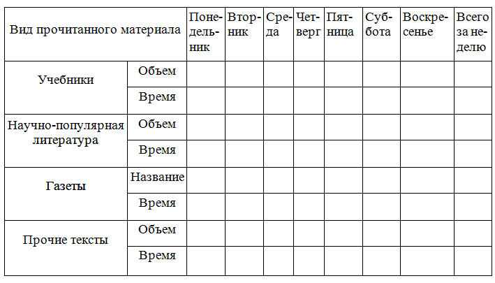 Проведите в течение недели анализ чтения. Фиксируйте ежедневно все, что вы читаете, замечайте время, которое затратили на чтение. Занесите результаты наблюдений в табл. 3.