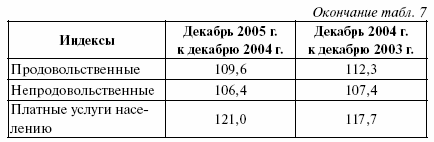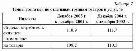 Впервые с 2001 г. в РФ в 2004 г. ускорился рост цен на продовольствие, для сравнения: на мясо на 8,9% в 2003 г. и на 19,6% в 2004 г. Но в то же время цены на непродовольственные товары и тарифы на платные услуги в 2004 г. росли медленнее, чем в 2003 г. Исключением был бензин, который подорожал на 31,3% в 2004 г., что в 2 раза больше его подорожания за 2003 г.(см. табл. 7)