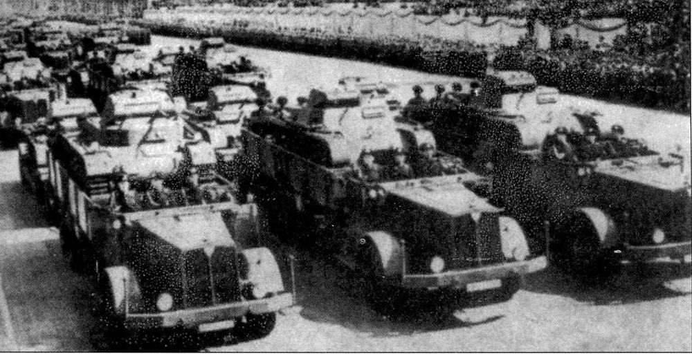 Тяжёлые грузовые автомобили Faun L900D567 с танками Pz-I и Pz-ll в кузовах на военном параде. Германия, 1937 г.
