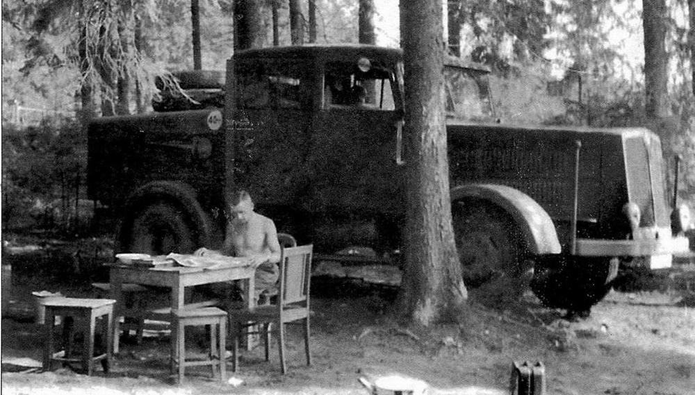 Это короткобазный капотный балластный тягач с двигателем 150 л. с. Колёсная формула 4x4. Кабина — двойная, вмещающая семь человек. Фотоснимок сделан в 1941 г. под Курском