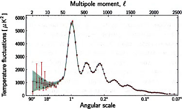 Рис. 31.2. Эффект акустических осцилляций, предсказанный Сахаровым и пересчитанный Сюняевым, Зельдовичем и др. для модели горячей Вселенной. Забегая вперед, приводим спектр мощности угловой анизотропии реликтового излучения, полученный космическим микроволновым телескопом «Планк». Пояснения — в следующей главе