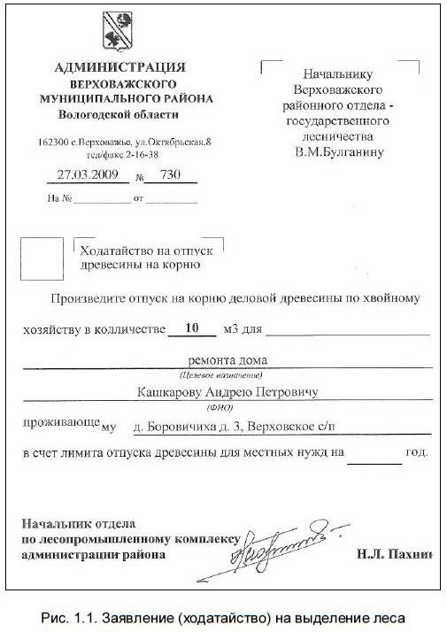 1. Написать заявление (рис. 1.1) на имя начальника районного отдела государственного лесничества с просьбой предоставить лес в нужном объеме с указанием цели. Заявление рассматривают примерно один месяц.