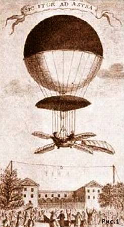 Так уж случилось, что французы научились летать раньше других. Первые полеты, начавшиеся в 1783 году, показали, что аэростат не безопасен в обращении и к тому же игрушка ветра. Пытаясь перелететь Ла-Манш, первый французский аэронавт Пилатр де Розье был унесен ветром и погиб. Более удачливым оказался механик Франсуа Бланшар. Он снабдил свой аэростат парашютом, веслами и хвостом (рис. 1).