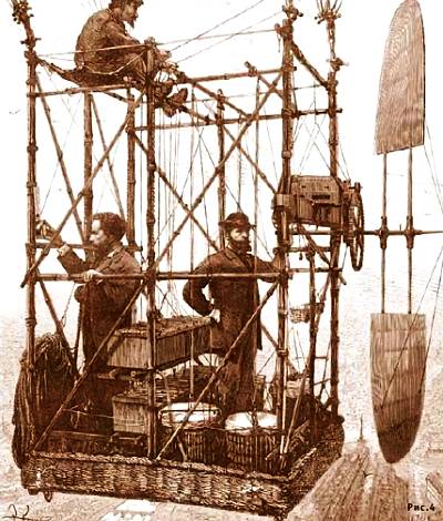 На рисунке 4 показано очень подробное изображение гондолы аэростата. В ней стоят Гастон и Альбер Тисандье. Обратите внимание на третьего члена экипажа. О нем тоже в литературе по истории техники никогда не упоминалось. Это был рулевой Лекомт, старый моряк.