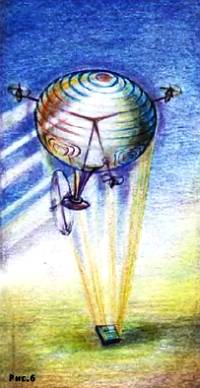 Вас это удивляет? А ведь все просто! Как хорошо было бы разместить антенну телевизионного передатчика на высоте 20–30 км. Для этого очень подходит аэростат. Нужно лишь сделать так, чтобы его не сносило ветром. Канат в этом случае не годится. Вот и потребовался бы дирижабль, который, работая на всю мощь своих винтов, выполняет лишь одну задачу: стоять на месте, какой бы силы ветер ни дул. Энергию для работы его двигателей можно получить из разных источников. Но следует учесть уникальность случая. Дирижабль относительно земли неподвижен. Значит, можно подавать ему энергию с земли пучком электромагнитных волн (рис. 6).