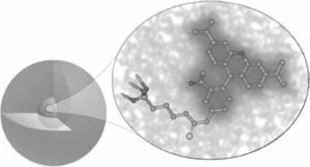 Рис. 4. Схематическое представление «корнельской наноточки» (Cornell Dot), в которую входит несколько молекул флуоресцентного родамина, окрашенного и включенного в центр капсулы. Окраска может изменяться в совокупности с кремнием, показанным слева в капсуле[350]