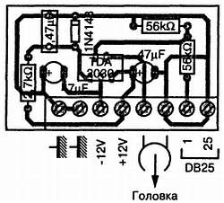 Чертеж печатной платы усилителя записи представлен на рис. 4.5. Размеры платы, что уже стало привычным, должны позволять разместить ее в непосредственной близости от записывающей головки.