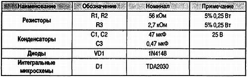 Поскольку ИС TDA2030 обладает большим коэффициентом усиления, то с разомкнутым контуром отрицательной обратной связи она может работать в качестве компаратора. Порог переключения схемы фиксируется с помощью простого диода и составляет приблизительно 0,7 В, что более чем вдвое меньше нижнего уровня выходного напряжения логической 1 параллельного порта ПК. Ниже мы рассмотрим ситуацию подачи на этот усилитель сигнала с линии