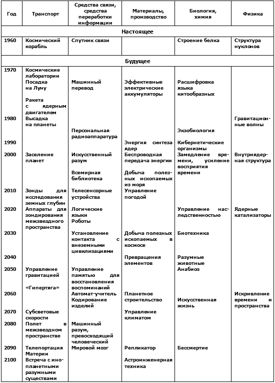 К нижеприведенной таблице, конечно, не следует относиться излишне серьезно. Тем не менее экстраполяция в будущее шкалы распределения во времени научных достижений прошлого — занятие и занимательное и поучительное. Во всяком случае, краткая сводка всего, что произошло за последние 150 лет, должна убедить любого, что современное воображение не способно заглянуть дальше 2100 года. Я это даже и не пытался сделать.