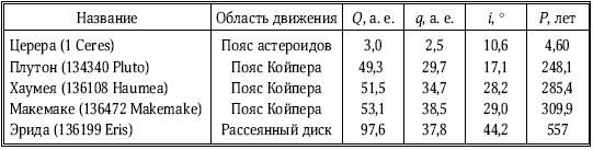 Планеты-карлики: параметры орбиты (Q и q — расстояние в афелии и перигелии; i – наклонение орбиты к эклиптике)
