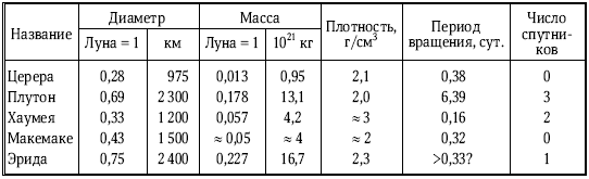 Только точное измерение размера и массы тела позволяет вычислить его среднюю плотность, узнать характерный состав и решить, можно ли зачислить это тело в группу планет-карликов. Расчеты показывают, что ледяные тела принимают округлую форму при диаметре более 400 км, а льдисто-каменистые тела типа Цереры – при диаметре более 900 км. По этим параметрам в Солнечной системе пока насчитывается 5 карликовых планет (табл. 7.4 и 7.5), но нет сомнения, что их намного больше: за Нептуном, вероятно, обнаружатся сотни льдистых тел размером более 400 км. Уже обсуждается несколько кандидатов в карликовые планеты. Сейчас в списке первоочередников около дюжины объектов размером более 650 км, среди которых Седна, Варуна, Квавар, Иксион (Ixion), Орк (Orcus), Веста, Паллада, Гигия и другие крупные объекты пояса астероидов и ТНО.