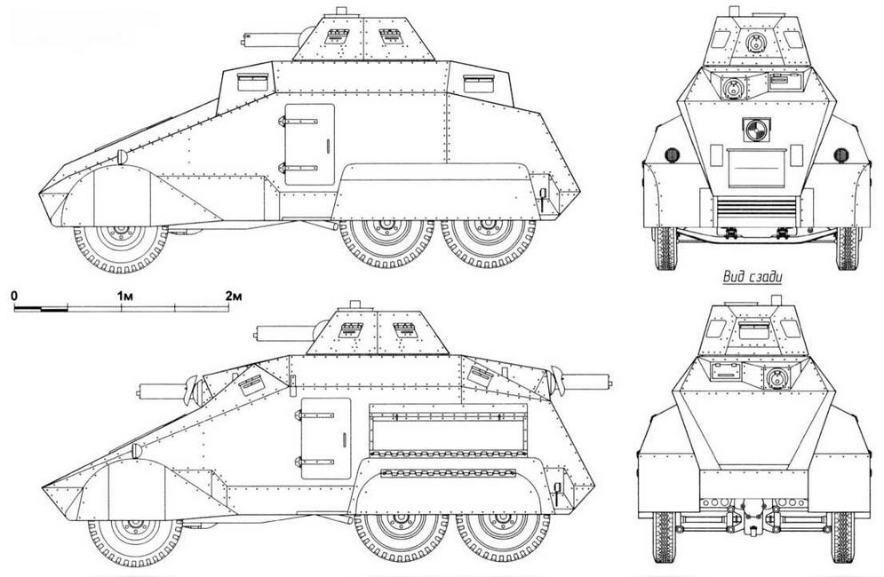 Чертежи голландского бронеавтомобиля Wilton-Fijenoord на шасси Krupp L2H143: с одним пулемётом во вращающейся башне и с тремя пулемётами — в башне, спереди и сзади в корпусе