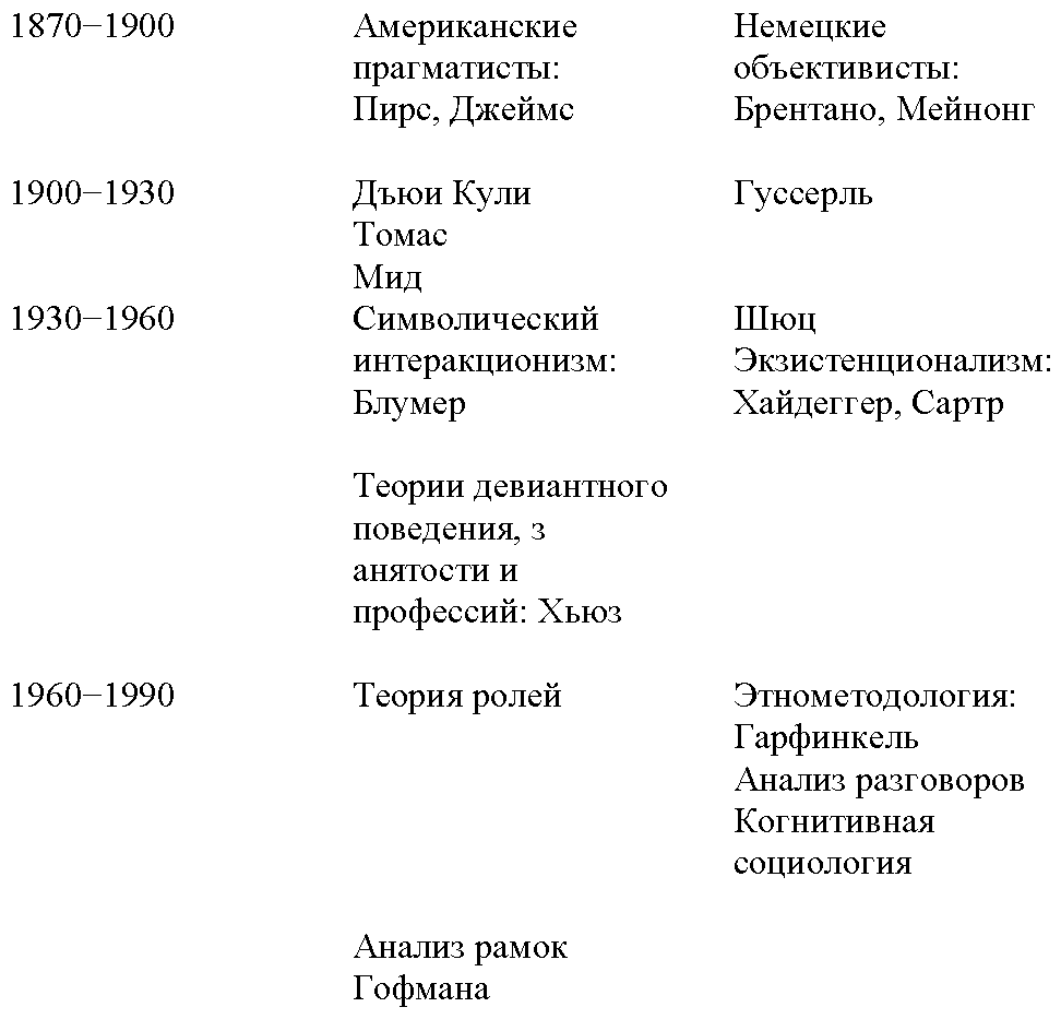 Именно этой идее следовали американские социологи. Первые американские философы и социологи учились в Германии, следуя моде конца XIX века. Вспомним, что это было время, когда американские колледжи реформировались и расширялись в исследовательские аспирантуры. Германские университеты, которые прошли этот процесс за 75 лет до этого, служили для них эталоном. Поэтому неудивительно, что первые американские социологи импортировали немецкие идеи. В 1940–1950-х годах новая волна микросоциологии была инициирована в США беженцем из Германии Альфредом Шюцем, который вдохновил Гарольда Гарфинкеля на создание этнометодологии. Гарфинкель привил на американской почве и другую группу немецких идейных предшественников, прежде всего философов Эдмунда Гуссерля и Мартина Хайдеггера.