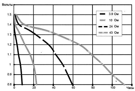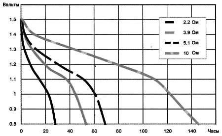 Рис. 9.3. Типовые разрядные кривые щелочного элемента типоразмера АА при 20 °C и различных сопротивлениях нагрузки