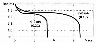 Никель-металлгидридные (NiMH) — это все пальчиковые аккумуляторы, которые продаются в киосках. Номинальная емкость для элементов одного размера различается, и обычно написана на ник большими буквами. Когда-то эту нишу занимали NiCd (они еще выпускались с этикетками на белом фоне, чтобы отличить от батареек), но «зеленые» настояли, и теперь NiCd можно приобрести лишь в специализированных точках продаж. Конечно, дело не только в загрязнении окружающей среды — NiMH-аккумуляторы имеют большую, чем NiCd, удельную емкость (60-120 Вт-ч/кг) и не склонны к «эффекту памяти», потому заряжать их можно не обязательно «с нуля». Зато они боятся глубокого разряда (хотя и не в такой степени, как СКА), и хранить их надо хотя бы частично заряженными. При этом они имеют самый высокий из всех типов саморазряд (вдвое больше, чем у NiCd) и страшно не любят перезарядки, потому что сильно нагреваются в конце процесса заряда (это, кстати, может служить одним из признаков того, что зарядку пора заканчивать). Типичные кривые зависимости напряжения от времени работы для таких аккумуляторов показаны на рис. 9.4.