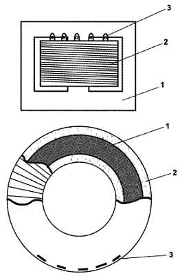 1 — сердечник, 2 — обмотки; 3 — выводы обмоток