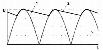 1 — исходное пульсирующее напряжение в отсутствие фильтрующего конденсатора;