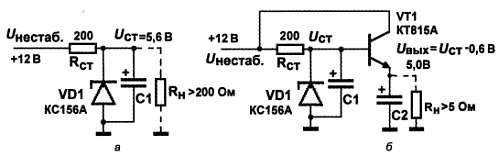 Простейший стабилизатор — это стабилитрон, который мы рассматривали в главе 7. Если параллельно ему подключить нагрузку Rн (рис. 9.9, а), то напряжение на ней останется стабилизированным до тех пор, пока ток через нее не будет слишком велик. Рассчитывается схема так, чтобы в отсутствие стабилитрона напряжение в средней точке делителя из Rc, и Rн было не ниже номинального напряжения стабилизации стабилитрона Uст, иначе при его подключении ток через него не пойдет, и стабилитрон не откроется. В результате максимальный ток, который мы можем получить в такой схеме, не превышает нескольких десятков миллиампер — в зависимости от мощности стабилитрона. Такой стабилизатор называют еще параметрическим.