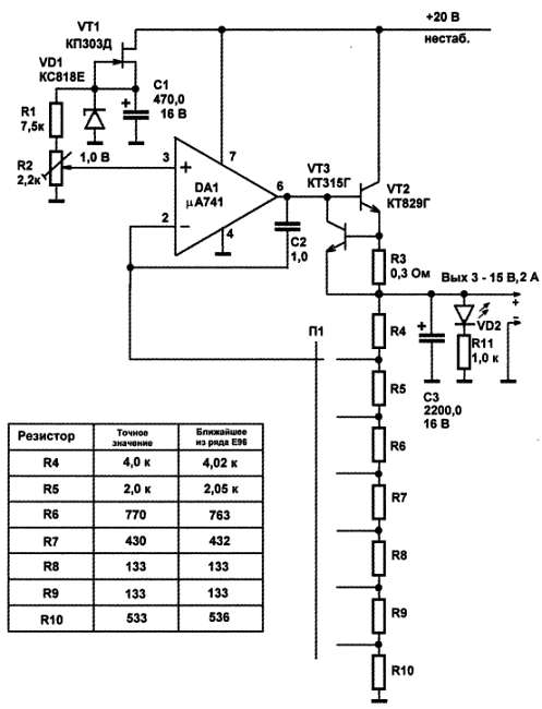 Именно так и работает схема источника на рис. 9.12. Переключатель П1 имеет 6 положений, в каждом из которых он изменяет соотношение делителя в обратной связи таким образом, чтобы при напряжении 1 В на «плюсовом» входе на выходе получался некий ряд фиксированных напряжений. При указанных в таблице номиналах резисторов R4-R10 этот ряд будет следующим: 3; 5; 7,5; 10; 12 и 15 В, чего достаточно для большинства наших нужд.