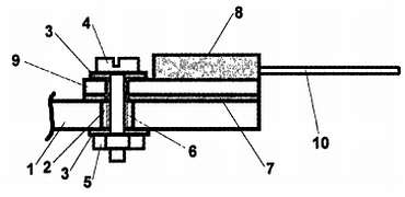 1 — радиатор; 2 — отверстие в радиаторе; 3 — изолирующие шайбы; 4 — стягивающий винт; 5 — гайка; 6 — изолирующая трубка; 7 — слюдяная прокладка; 8 — пластмассовая часть корпуса транзистора; 9 — металлическая часть корпуса транзистора; 10 — выводы транзистора