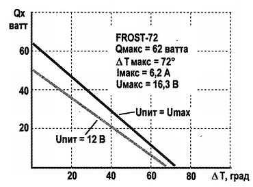Из этих данных легко рассчитать охладитель с элементом Пельтье, скажем, для компьютерного процессора. Если процессор в максимуме производительности выделяет, например, 50 ватт тепла, то единичный элемент типа FROST-72 с ним просто не справится, — при 12 вольтах питания он окажется близок к нулевому перепаду температур. В этом случае придется ставить два элемента, причем если их поставить параллельно рядом (теплораспределительная прокладка должна быть очень хорошей!), то на два следует умножать максимальное количество тепла, а если последовательно друг над другом, то удвоится максимальный перепад температур.