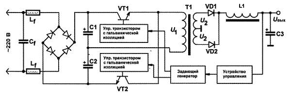 Здесь сетевое напряжение 220 В выпрямляется стандартным мостом, а затем делится пополам с помощью конденсаторов С1 и С2. Ключевые транзисторы VT1 и VT2 попеременно подключают обмотку высокочастотного трансформатора Т1 на ферритовом сердечнике то к плюсу входного напряжения, то к минусу. Все эти элементы должны быть рассчитаны как минимум на половину амплитудного значения сетевого напряжения (т. е. на 160–170 В, если с некоторым запасом). Напряжение со вторичной обмотки выпрямляется по стандартной схеме двухполупериодного выпрямителя на двух диодах (сравните со схемой на рис. 9.8). Выходное напряжение сглаживается LC-фильтром. Оно поступает на устройство управления, где сравнивается с заданным. Устройство это управляет включением генератора импульсов, который, в свою очередь, управляет ключевыми транзисторами. В качестве гальванической развязки обычно используют малогабаритные трансформаторы. Входной фильтр из двух дросселей Lf и конденсатора Cf служит для защиты внешней сети от помех.