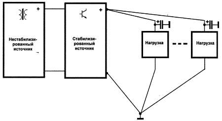 Стандартная схема грамотной разводки питания между источниками и потребителями в электронных устройствах приведена на рис. 9.20.