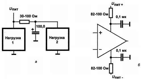 На рис. 9.21, а показана схема развязывающего фильтра для маломощной нагрузки в пределах одного электронного узла. Это может быть входной каскад усиления микрофонного усилителя, который особо чувствителен к качеству питания, и его требуется развязать от следующих более мощных каскадов. На рис. 9.21, б показана правильная организация питания с такими фильтрами для быстродействующих или прецизионных измерительных усилителей — в частности, в измерительных схемах, о которых мы будем говорить в следующих главах.