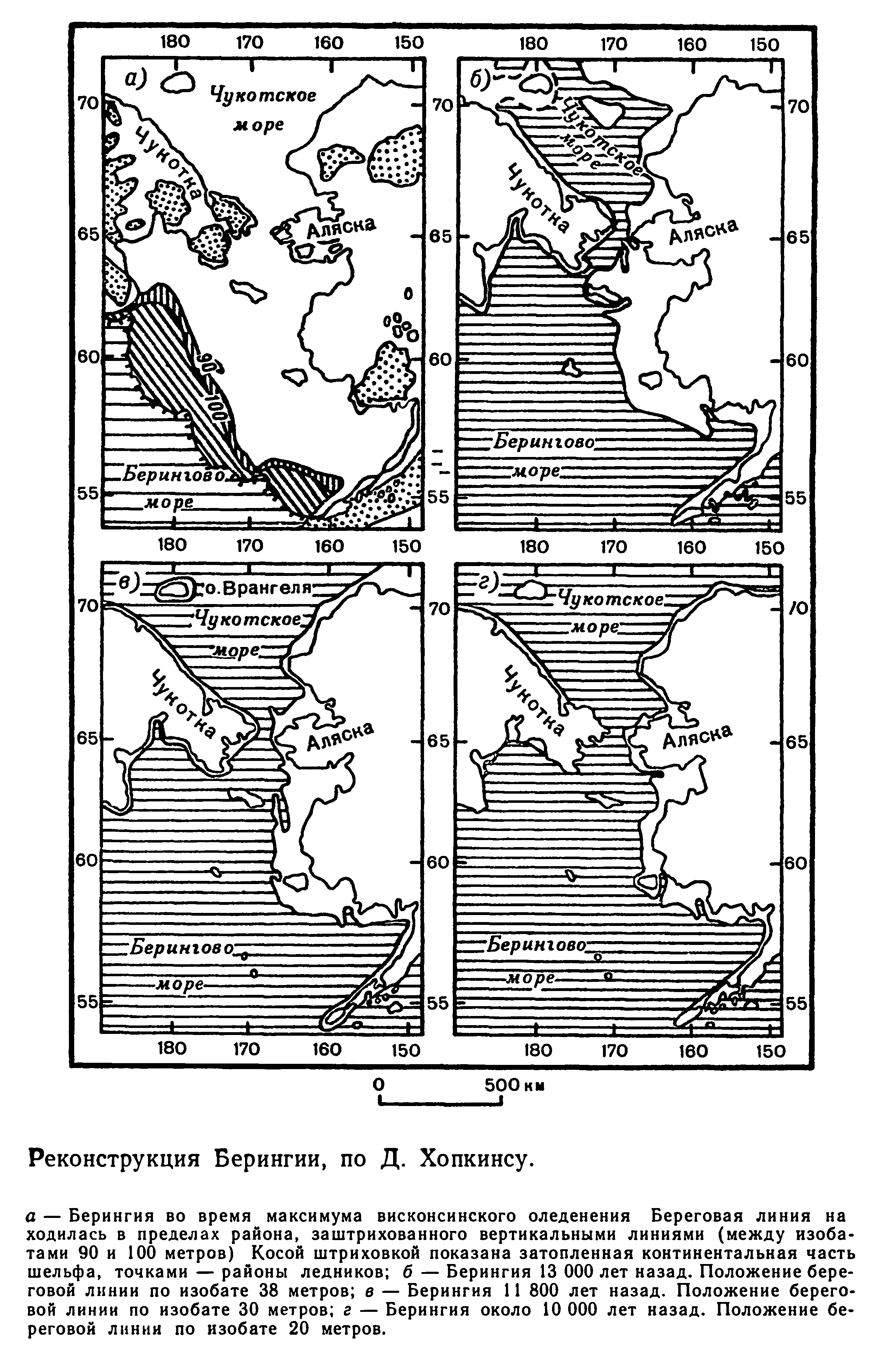 а — Берингия во время максимума висконсинского оледенения береговая линия находилась в пределах района, заштрихованного вертикальными линиями (между изобатами 90 и 100 метров) Косой штриховкой показана затопленная континентальная часть шельфа, точками — районы ледников; б — Берингия 13 000 лет назад. Положение береговой линии по изобате 38 метров; в — Берингия 11 800 лет назад. Положение береговой линии по изобате 30 метров; г — Берингия около 10 000 лет назад. Положение береговой линии по изобате 20 метров.