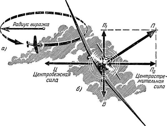 Рис. 29. Вираж самолета: а) вираж по кругу; б) действие сил на вираже: вертикальная слагаемая подъемной силы П1 уравновешивает силу веса В, а горизонтальная слагаемая П2 играет роль центростремительной силы.