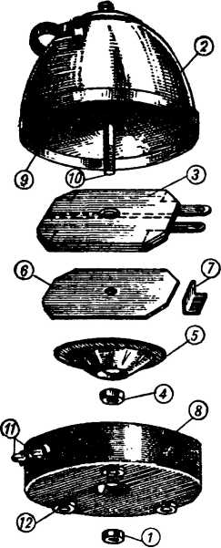 Сначала ко дну 9 чайника прикладывают первую слюдяную пластинку, затем укладывают на нее нагревательный элемент так, чтобы он не касался дна и стенок корпуса чайника. После этого нагревательный элемент покрывают второй слюдяной пластинкой. На эту пластинку накладывают металлическую пластинку 6, под которую подкладывают изоляционную прокладку 7, надежно защищая концы нагревательного элемента от соприкосновения с пластинкой. Затем надевают на болт 10 металлический диск 5 и завинчивают гайку 4, плотно прикрепляя все части ко дну корпуса. После этого концы нагревательного элемента присоединяют к зажимам штифтов 11, причем следят за тем, чтобы они не касались корпуса и металлических частей. Основание с изоляционными подкладками 12 прикрепляют к корпусу, завинчивая гайку 1.