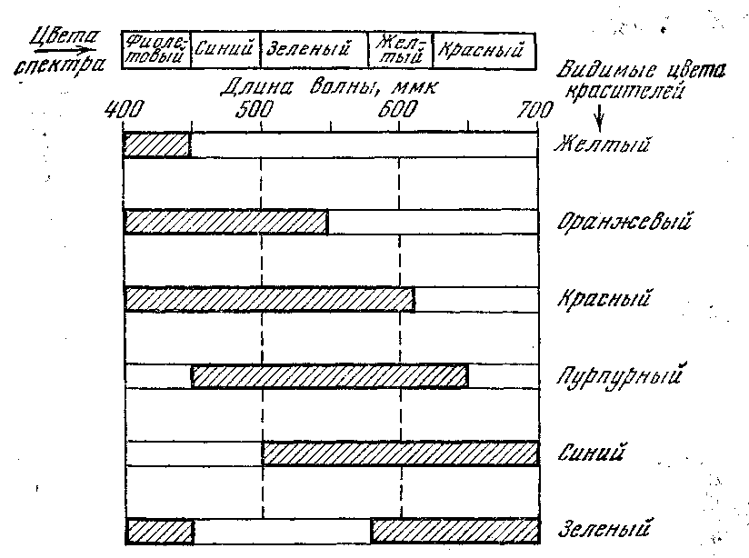Рис. 13. Зависимость цвета красителя от поглощения лучей спектра (заштрихована часть спектра, поглощенная красителем)