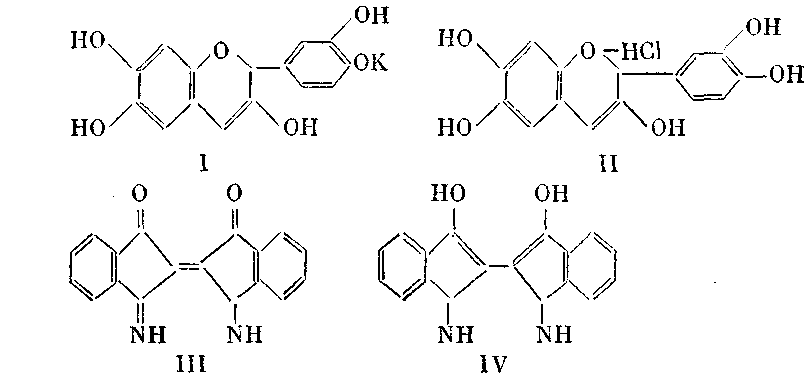 Все сказанное о структуре относится не только к синтетическим, по и к естественным красителям, в частности к антоцианам, основным элементом которых являются все те же бензольные кольца, а введение гидроксильных групп, кислотных или основных группировок изменяет цвет красителя. Калиевая соль антоциана, обладающая щелочными свойствами, придает синий цвет василькам (I). В результате присоединения кислотной группы к основному антоциану образуется краситель, придающий красный цвет розам (II). Молекула индиго (III) после присоединения двух атомов водорода становится бесцветной, но приобретает растворимость (IV).