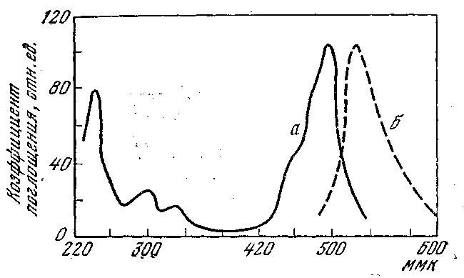Рис. 14. Спектры поглощения (а) и флуоресценции (б) красителя флуоресцеина. Кривая люминесценции, сдвинутая в сторону более длинных волн, зеркально воспроизводит кривую поглощения