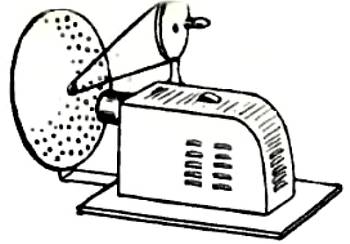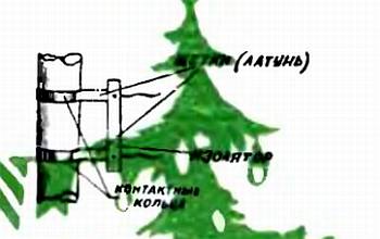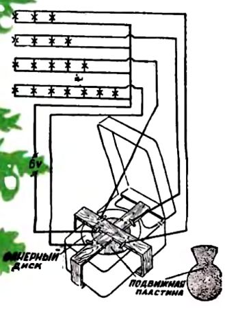 На диске проигрывателя устанавливают фанерный круг, на котором укреплена подвижная пластинка вырезанная из латуни или жести. Над проигрывателем укрепляется деревянная крестовина, на которой укреплены щетки-контакты (см. рис.) из упругой латуни. Высоту стоек, поддерживающих крестовину, необходимо подобрать так, чтобы контакты во время вращения диска касались подвижной пластинки, не тормозя при этом вращения диска.