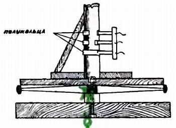 В школьных мастерских выточите ось, диаметр которой определяется внутренним диаметром втулки колеса. С обоих концов оси нужно нарезать резьбу и подобрать гайки. Нижняя доска, на которой укрепляется ось, прибивается к полу. Далее заготовьте широкую доску с таким расчетом, чтобы ее концы опирались на обод колеса. В центре ее просверлите, и надев на ось, закрепите впотай гайкой, кроме того, в нескольких местах привяжите мягкой проволокой к спицам.