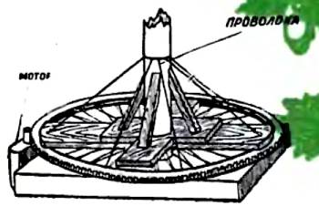 Если немного потрудиться, то можно сделать так, чтобы ваша елка в нужный момент «ожила» — стала медленно вращаться. На рисунке показано устройство для вращения елки высотой до 2–2.5 метра. Основной деталью его является переднее колесо велосипеда (можно временно снять с любого велосипеда; портить мы его не будем).