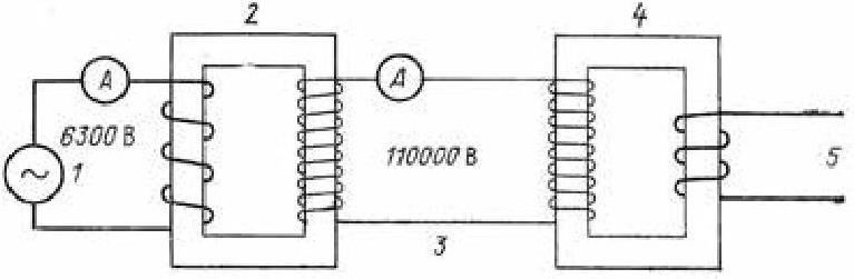 1 – генератор; 2 – повышающий трансформатор; 3 – линия передачи; 4 – понижающий трансформатор; 5 – потребитель.