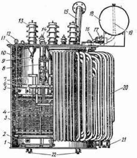 1 – бак; 2, 5 – нижняя и верхняя ярмовые балкимагнитопровода; 3 – обмотки ВН; 4 – регулировочныеотводы к переключателю; 6 – магнитопровод; 7 – деревянные планки крепления отводов; 8 – отвод от обмотки ВН; 9 – переключатель; 10, 12 – подъёмные шпильки и кольцо (рым); 11 – крышка бака; 13,14 – вводы ВН и НН; 15 – предохранительная (выхлопная) труба; 16 – маслопровод; 17 – газовое реле; 18 – расширитель; 19 – указатель уровня масла; 20 – маслоохладительные (циркуляционные) трубы; 21 – маслоспускной кран; 22 – каток тележки.
