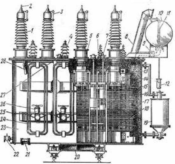 1 – маслонаполненный ввод ВН (110кВ); 2 – токопроводящий стержень (шпилька); 3 – указатель уровня масла ввода ВН; 4, 6 – вводы СН (35кВ) и НН (10кВ); 5 – бумажнобакелитовый цилиндр ввода ВН; 7 – привод переключающего устройства обмотки ВН; 8 – предохранительная труба; 9 – газовое реле; 10 – расширитель (консерватор); 11 – указатель уровня масла в расширителе; 12 – воздухоочиститель; 13 – проушина для подъёма активной части трансформатора; 14 – ярмовая балка; 15 – линейный отвод ВН; 16 – переключающее устройство обмотки ВН; 17– обмотка ВН; 18 – экранирующие (ёмкостные) витки обмотки ВН; 19 – термосифонный фильтр; 20 – тележка с катками; 21 – площадка для установки домкрата; 22 – маслоспускной кран; 23 – бак; 24 – радиатор (трубчатый охладитель); 25 – электропроводка питания электродвигателей дутья; 26 – электродвигатель с крыльчаткой (дутьевой вентилятор); 27 – привод переключающего устройства обмотки СН; 28 – крюк для подъёма трансформатора.
