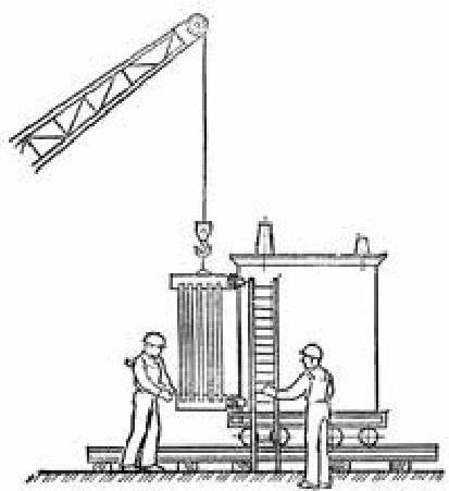 Рис. 69. Демонтаж радиатора трансформатора с помощью автокрана.